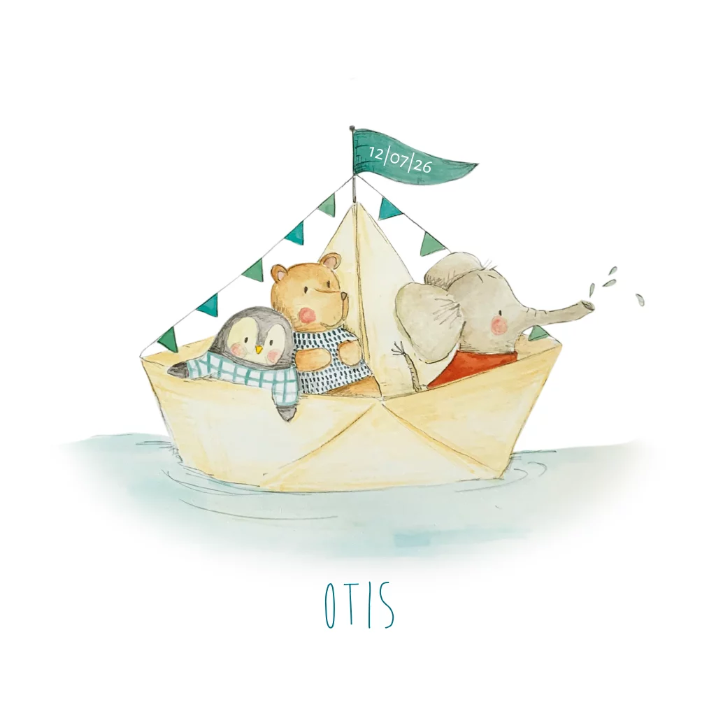 Dubbele kaart voor een jongen. Er zitten drie dieren in het gevouwen bootje: een beer, een pinguïn en een olifant.