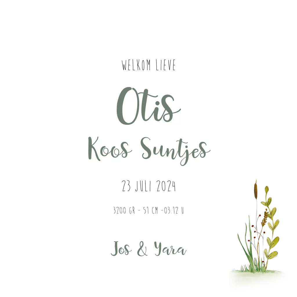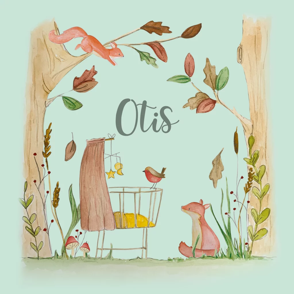 een prachtig geboortekaartje voor de herfst. De wieg staat in het bos, de bladeren vallen naar beneden.