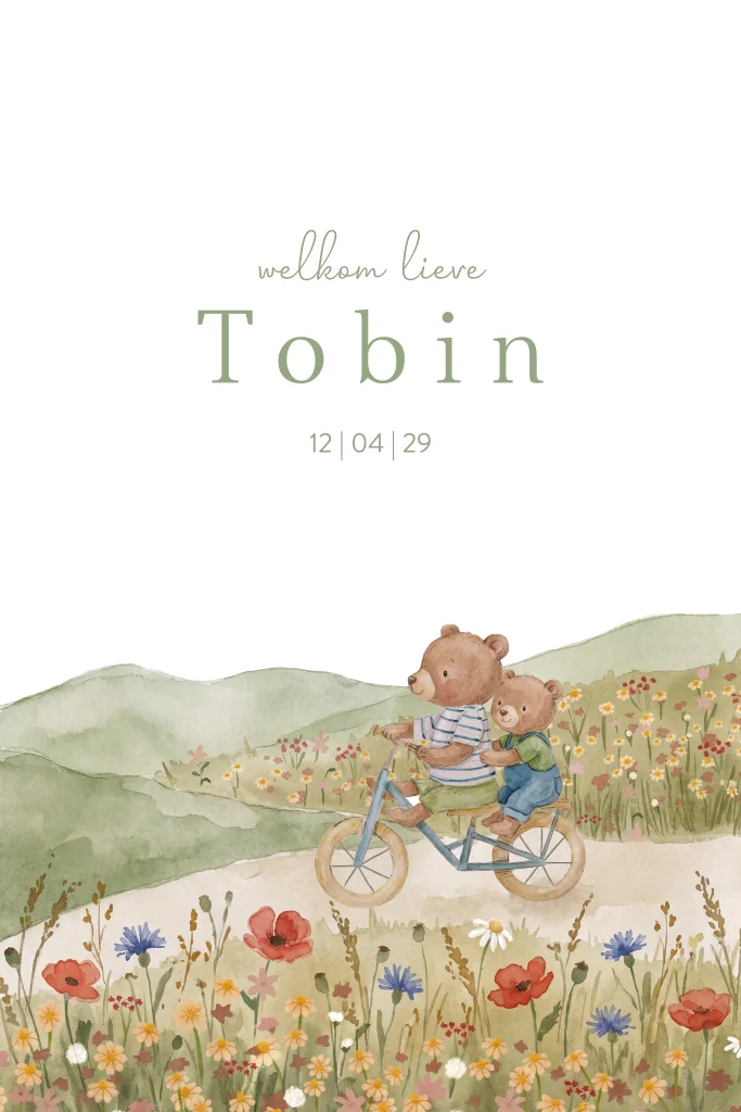 geboortekaartje 2 beertjes broertjes op fiets door bloemenveld