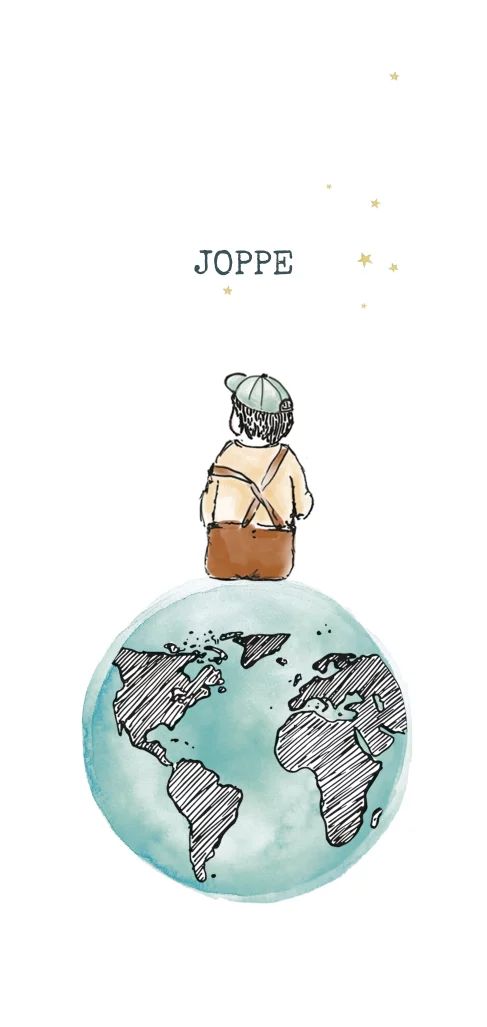 Een uniek geboortekaartje van een jongen op de wereldbol.