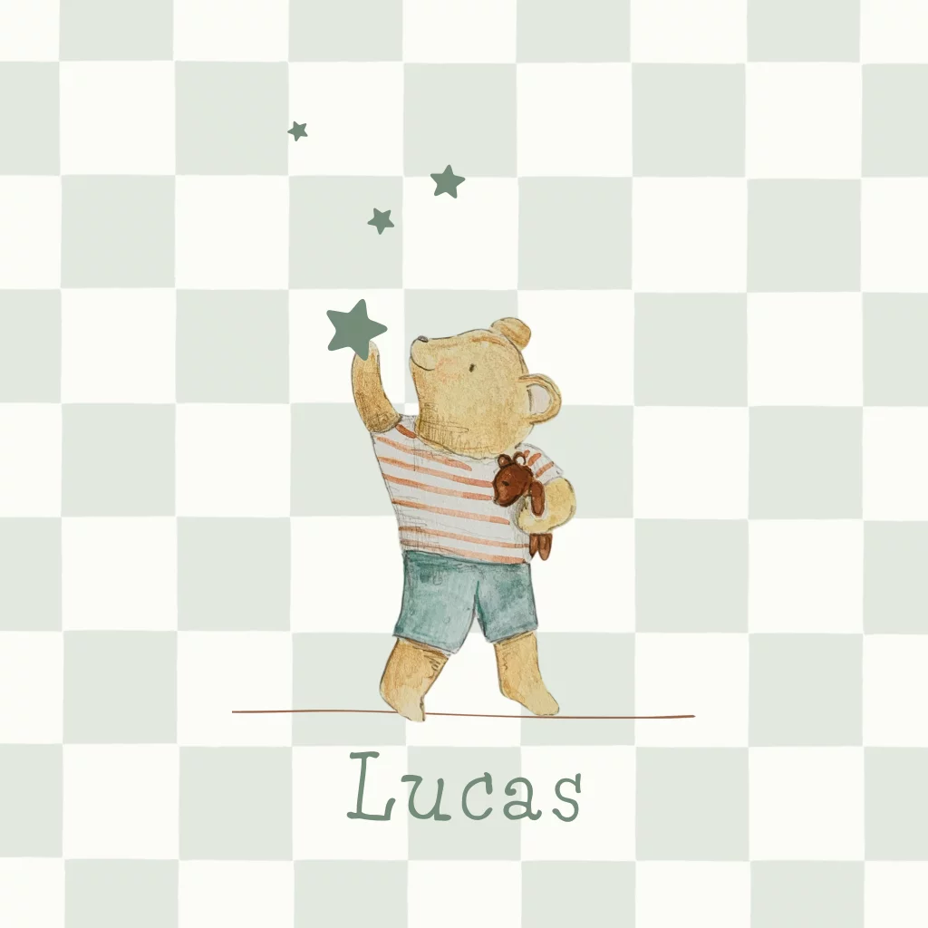 geboortekaartje met teddybeer en sterren en ruitpatroon