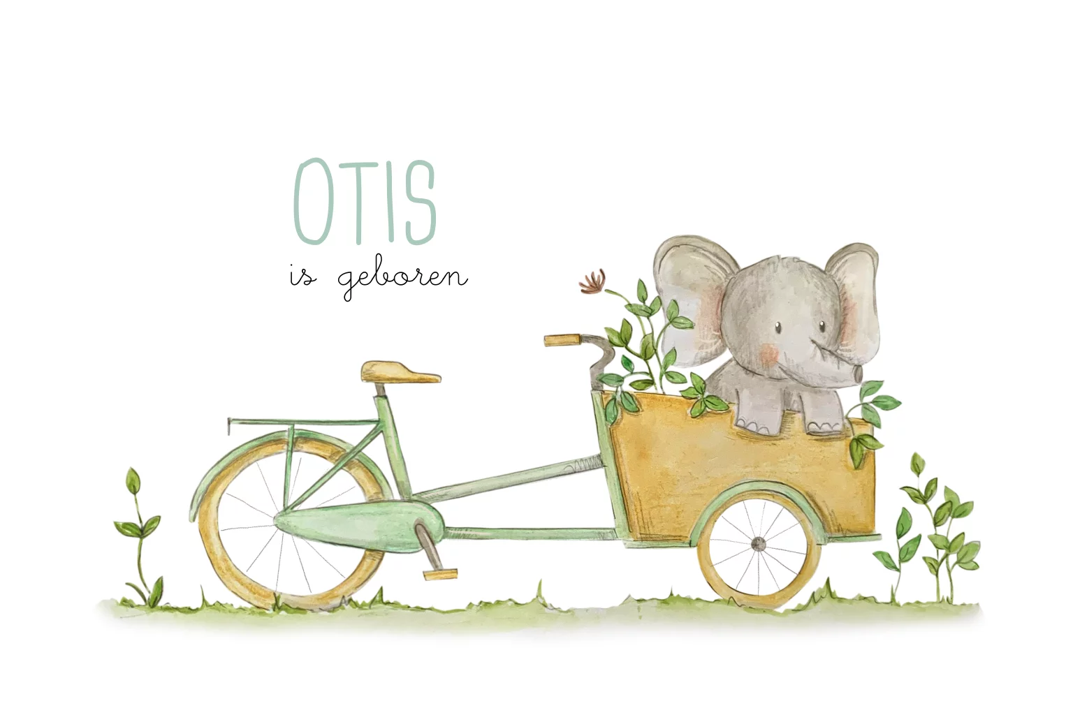 vrolijk geboortekaartje jongen bakfiets en olifant