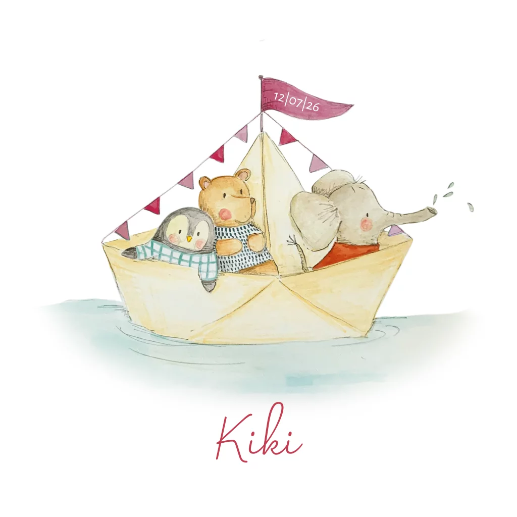 Dubbele kaart voor een meisje. Er zitten drie dieren in het gevouwen bootje: een beer, een pinguïn en een olifant.
