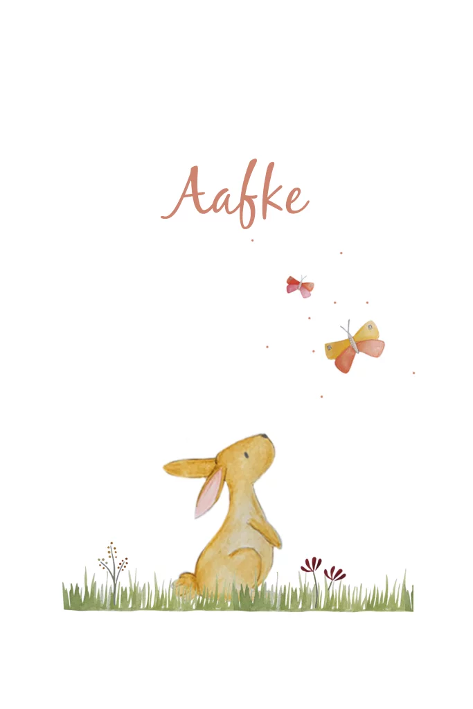 Een uniek geboortekaartje met een konijn en vlinders. Deze illustratie is met de hand geverfd: waterverf.