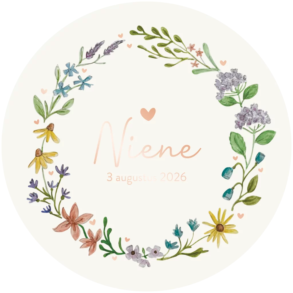 geboortekaartje bloemenkrans veldbloemen met rosefolie