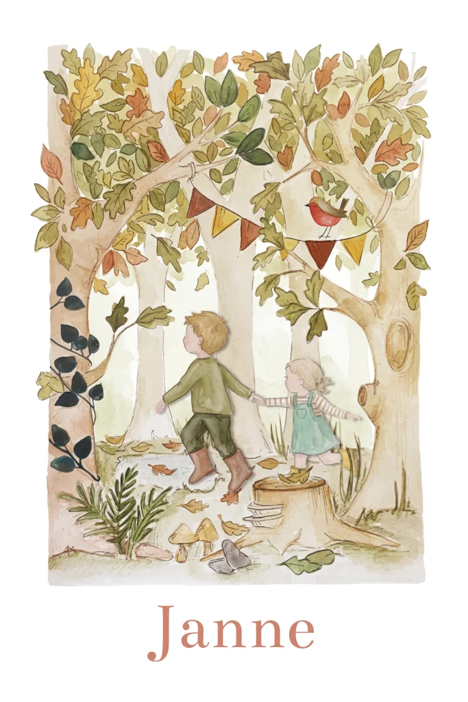 geboortekaartje met bos en bosdieren en broertje en zusje
