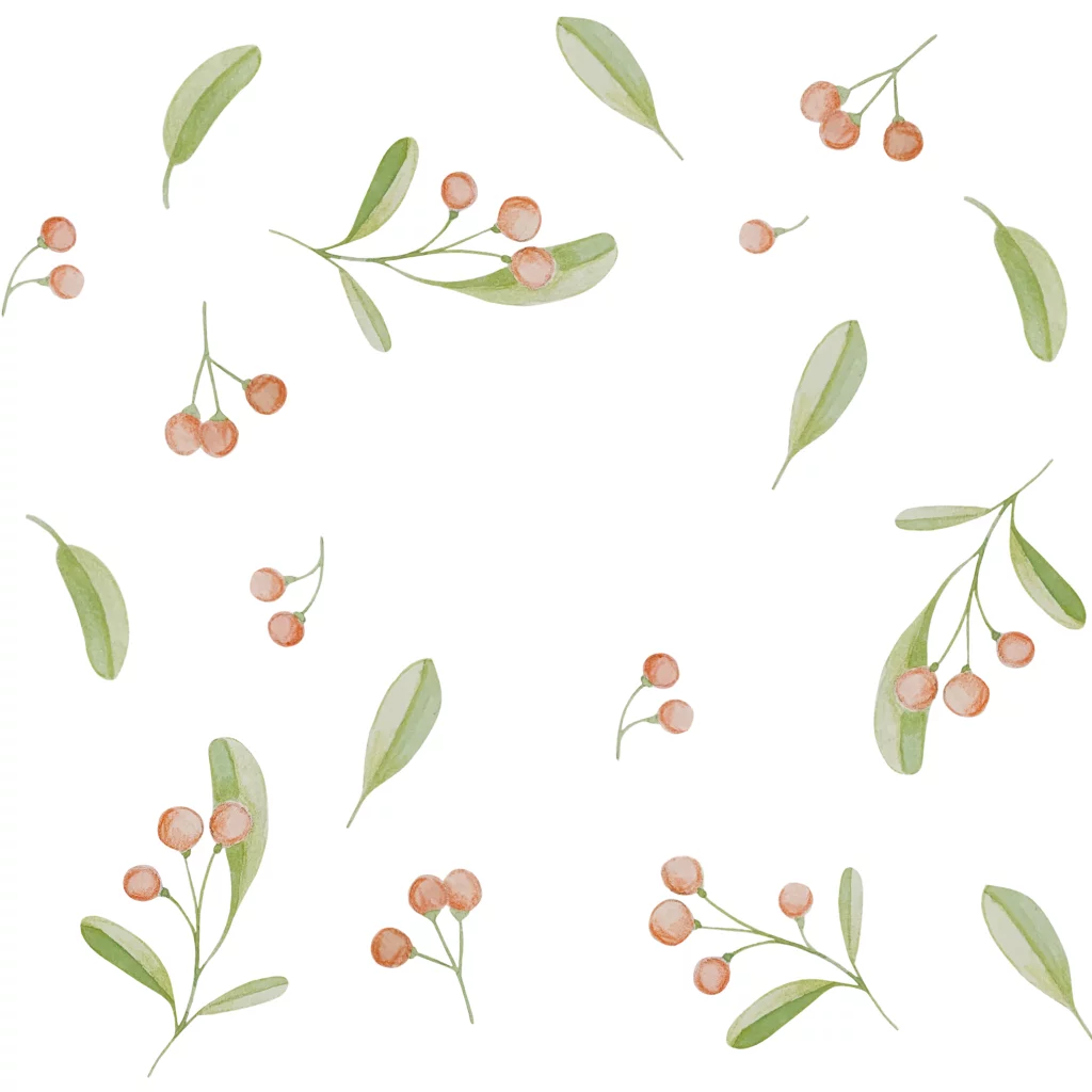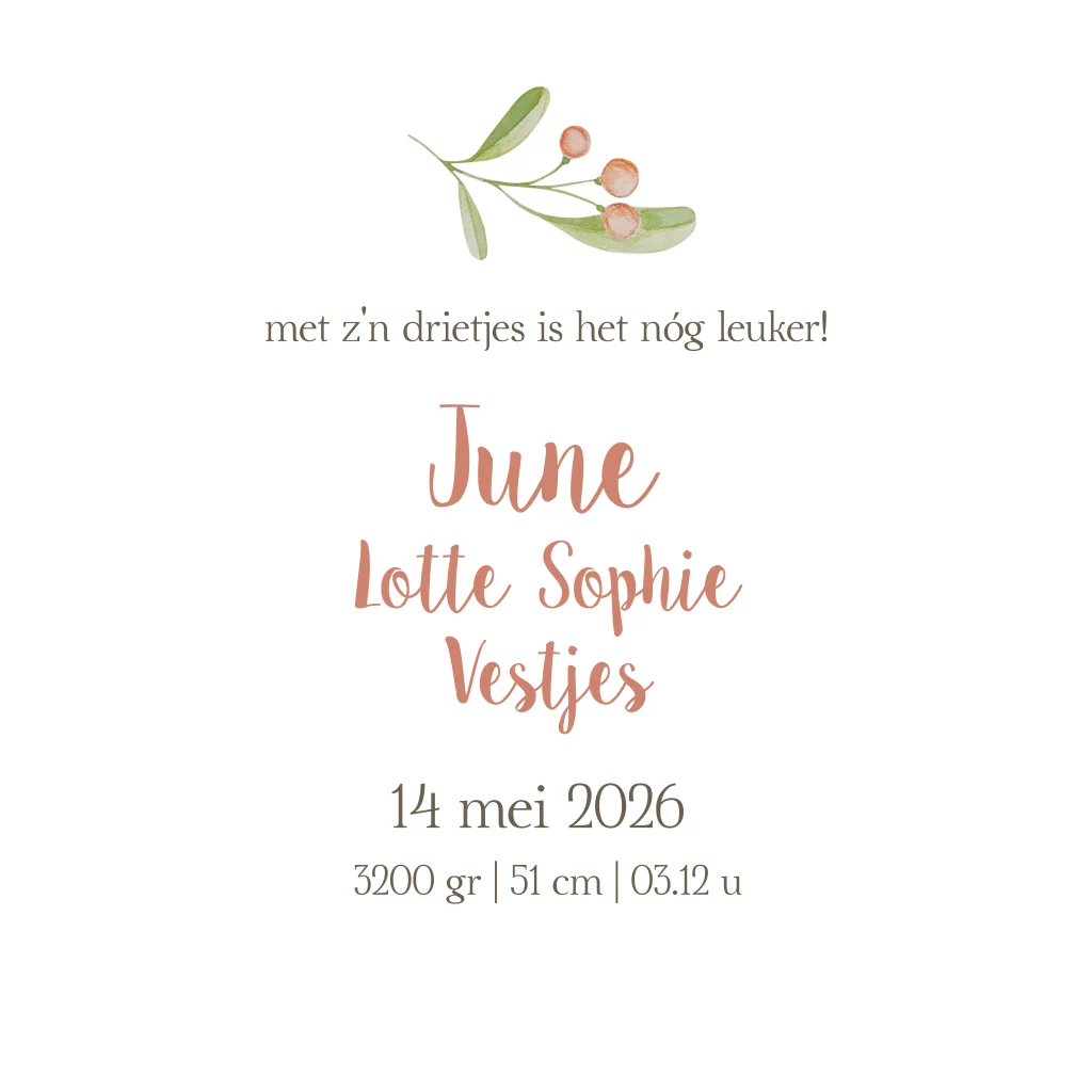 Een botanisch geboortekaartje met goudfolie. Ook de kleine bolletjes in het patroon zijn goudfolie. De bessentakjes en bladeren zijn met de hand geschilderd.