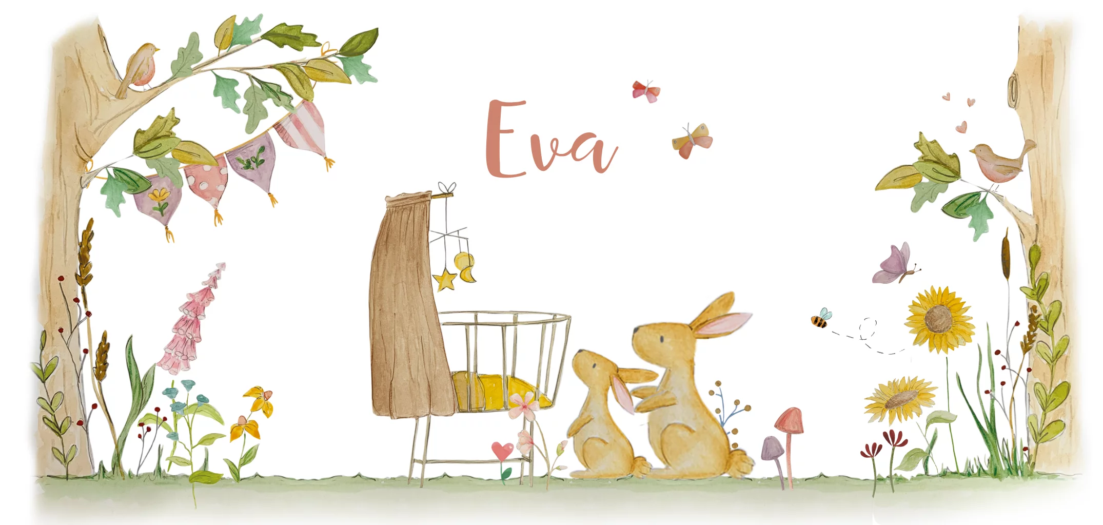 geboortekaartje lente zomer met wiegje in bos, omringd door bloemen.