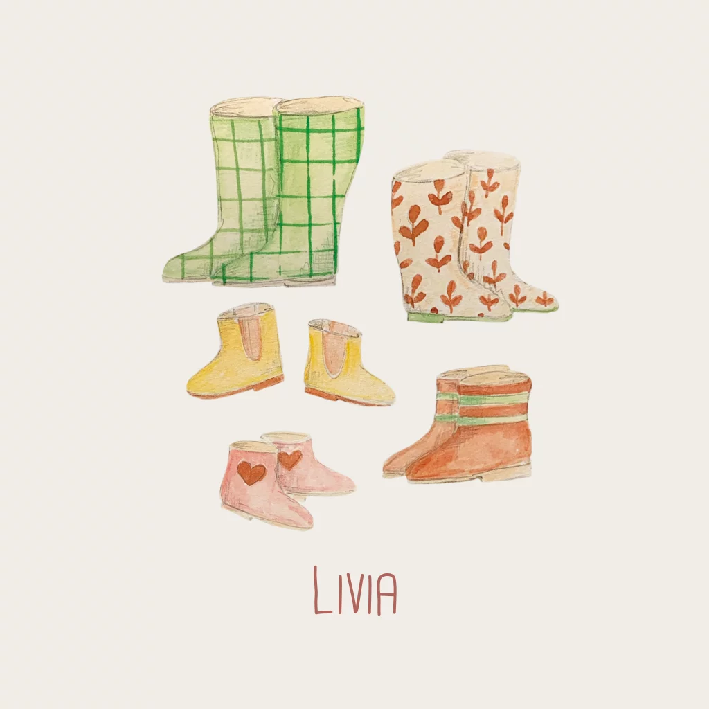 geboortekaartje met regenlaarsjes. Leuk voor de herfst of het voorjaar. Pas het kaartje eenvoudig zelf aan naar wens in de editor.