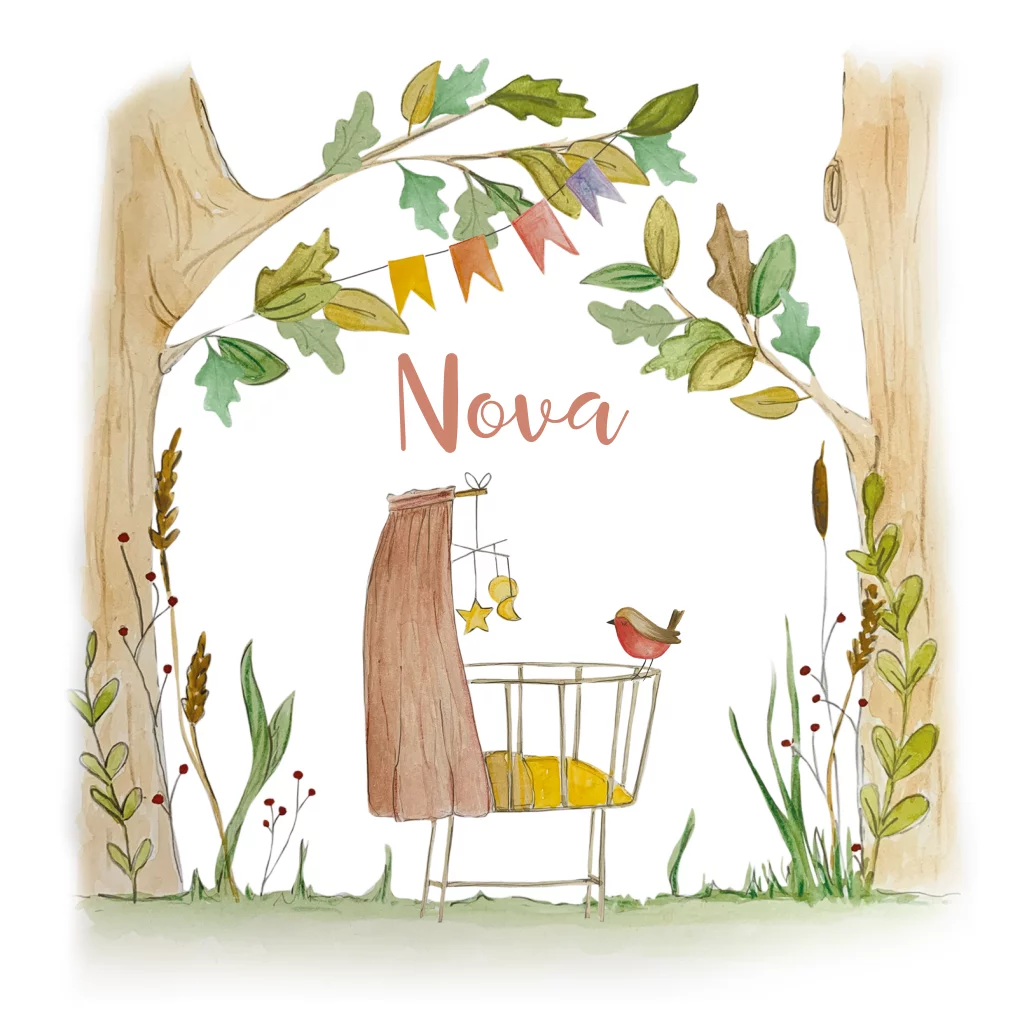 Een prachtig geboortekaartje met een wiegje. Het wiegje staat in het bos, tussen twee bomen. Een mooi botanisch geboortekaartje.