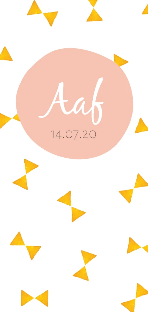Hip geboortekaartje met okergele driehoekjes. De combinatie van okergeel met roze is lief en tikkeltje eigenwijs. Het is een fris geboortekaartje. Pas het kaartje eenvoudig aan in de designtool en bestel een proefdruk voor maar 1 euro.