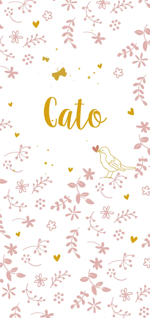 Een lief en vrolijk botanisch geboortekaartje . De blaadjes, bloemetjes, vogeltje en vlinders zijn met de hand getekend. Pas het kaartje eenvoudig aan. Kies bijvoorbeeld voor een andere achtergrond of een ander lettertype.