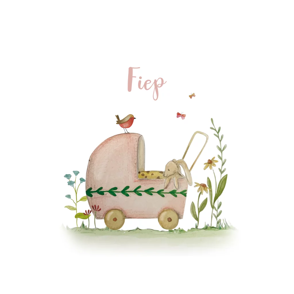 lief geboortekaartje kinderwagen roze met konijn tussen de bloemen