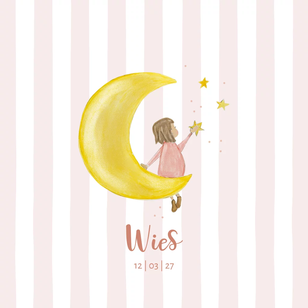 Een lief geboortekaartje is pastelkleuren. Het meisje zit op de maan en probeert de sterren te pakken. Een mooi rustig en stijlvol kaartje. De afgeronde hoeken maken het geheel helemaal af.