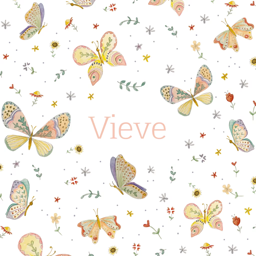 Een prachtig geboortekaartje voor meisje met vlinders. De vlinders zijn met de hand geverfd en hebben de mooiste patronen met pastelkleuren.
