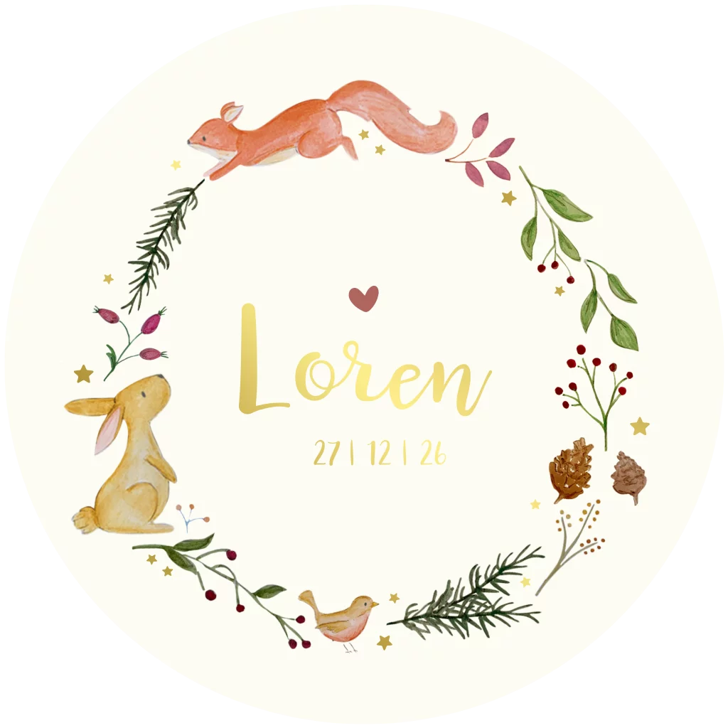 Verwelkom de komst van jullie kleintje met een betoverend geboortekaartje voor de winter. Met subtiele gouden accenten en prachtige illustraties van een schattige eekhoorn, takjes, konijn, vogel, besjes en een dennenappel, straalt dit kaartje de warmte en gezelligheid van het winterseizoen uit.