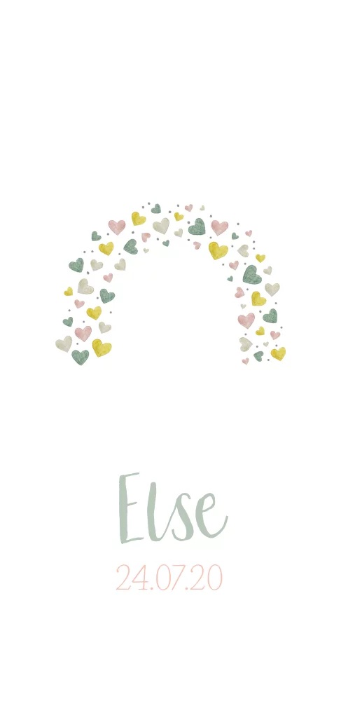 lief geboortekaartje met hartjes-regenboog. De waterverf hartjes komen het mooist tot zijn recht op structuurpapier. De pastelkleuren maken het kaartje lief en zacht. Pas het kaartje eenvoudig zelf aan en bestel een proefdruk voor maar 1 euro.