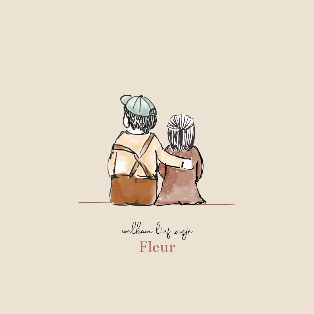 Een prachtig geboortekaartje van een jongetje en een meisje. Ze zitten samen; het jongetje slaat een arm om het meisje heen. Leuk voor een broertje en zusje. Een enkele kaart met afgeronde hoeken.