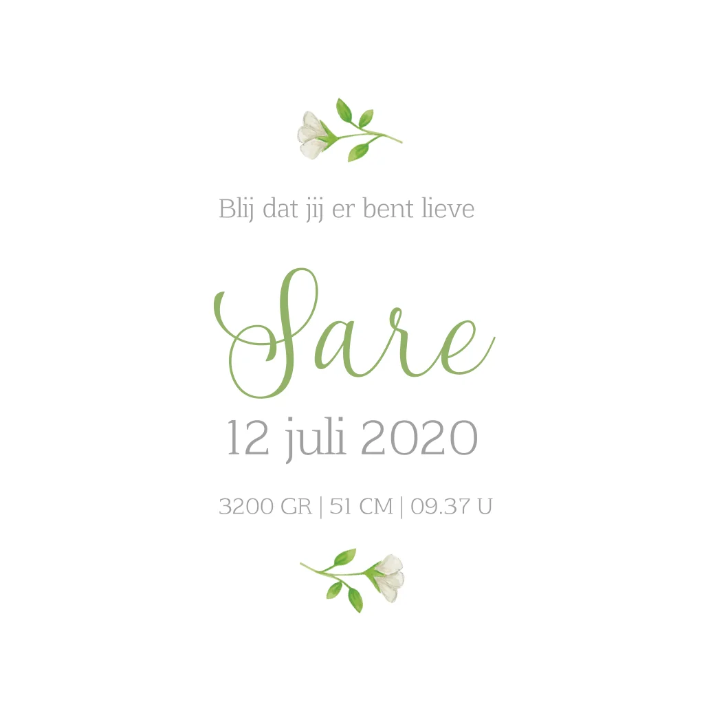 Een zacht en lief geboortekaartje. De bloemenkrans is geverfd met waterverf. Pas het kaartje eenvoudig zelf aan in de designtool.