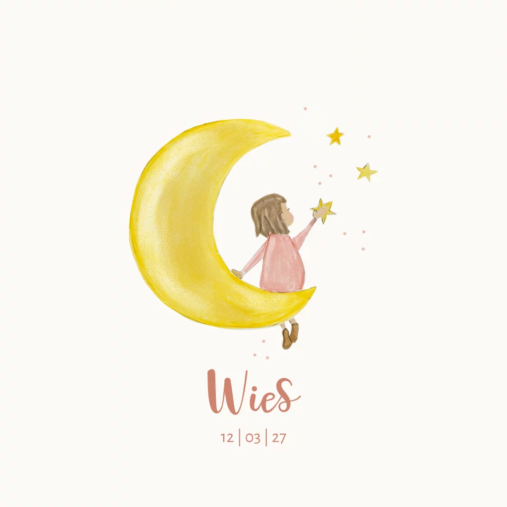 lief geboortekaartje met meisje op de maan tussen de sterren