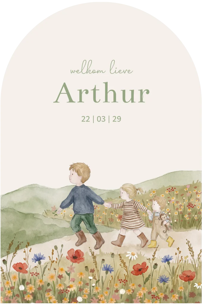 geboortekaartje Arc met drie kinderen in een bloemenveld