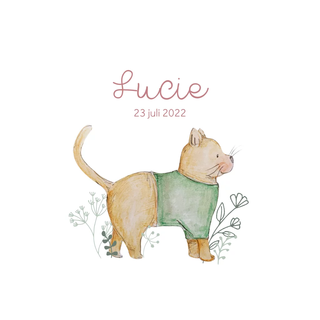 Geboortekaartje met poes en planten in pastel