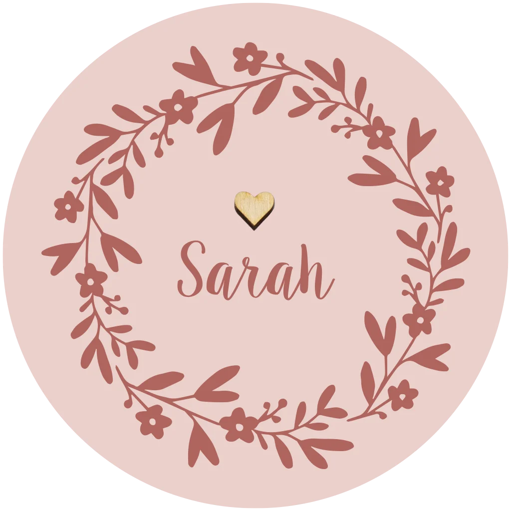 rond botanisch geboortekaartje roze met krans en echt houten hartje. het houten hartje wordt niet standaard meegeleverd. Dit dient los in de shop bestelt te worden.