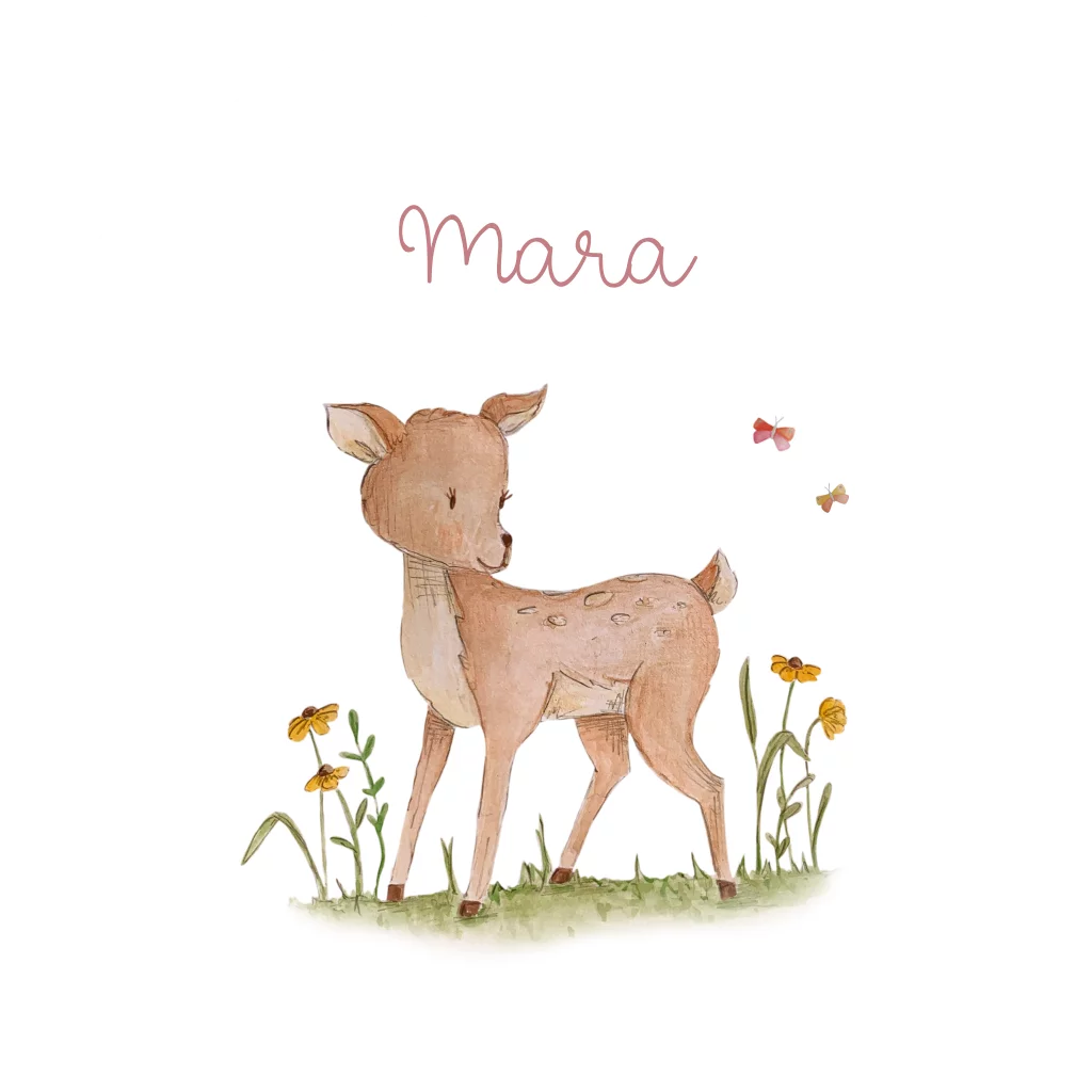 rond geboortekaartje met hertje, vlinders en bloemen