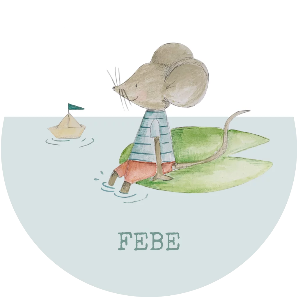 rond geboortekaartje jongen met muis en een bootje op het water.