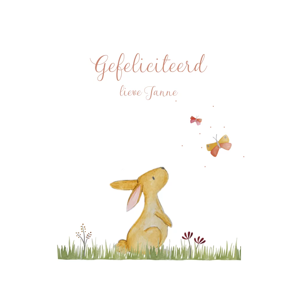 Een unieke wenskaart met een konijn en vlinders. Personaliseer het kaartje naar wens, voeg een leuke boodschap toe en verstuur rechtstreeks naar de ontvanger.