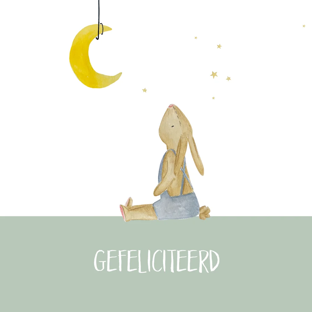 Een lieve wenskaart met een jongenskonijn die naar de maan en sterren kijkt.